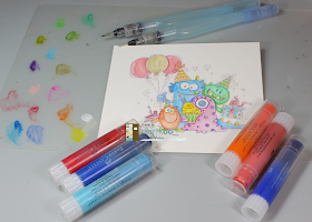 I printed the image on Canson XL watercolour paper and dabbed all the gelatos of my stash on a plastic sheet as a palette. I used waterbrushes to pick up the colour and paint the monsters in bright friendly colours.